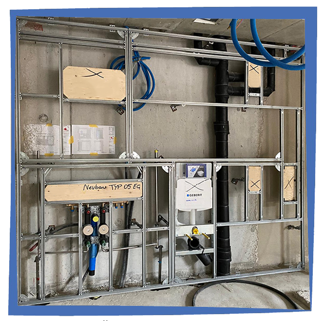 Auf Basis von Systemen der GEBERIT (Duofix, GIS-Profile, usw.) werden Badezimmer-Wände nach Mass vorfabriziert und mit den gewünschten Komponenten bestückt. Dies ermöglicht ein Maximum an Qualität und verkürzt den Zeitbedarf auf dem Bau markant! Mit uns als Lieferanten profitieren Sie davon. Also kontaktieren Sie uns, wenn Sie einen Umbau oder Neubau planen: Tel. 079 500 00 99